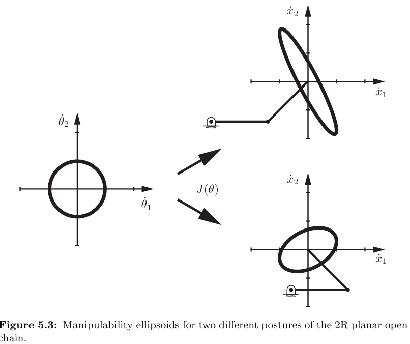 대응시켜 얻은 타원을 조작성 타원체라 부르며, 장축과 단측 비율이 1에 가까울수록 모든 방향으로 움직이기 쉬워지고 자세는 특이점으로부터 멀어진다. 반대로, 특이점에 가까워질수록 타원체는 선분에 가까워져 특정 방향으로 움직이지 못함을 나타낸다.