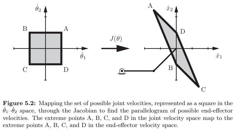 Figure 5.2의 경우 관절 속도 한곗값의 다각형을 자코비안을 통해 대응시키는 대신, 관절 속도 공간에서의 단위 원을 θ1 - θ2 평면으로 대응시키는 것도 가능하다.